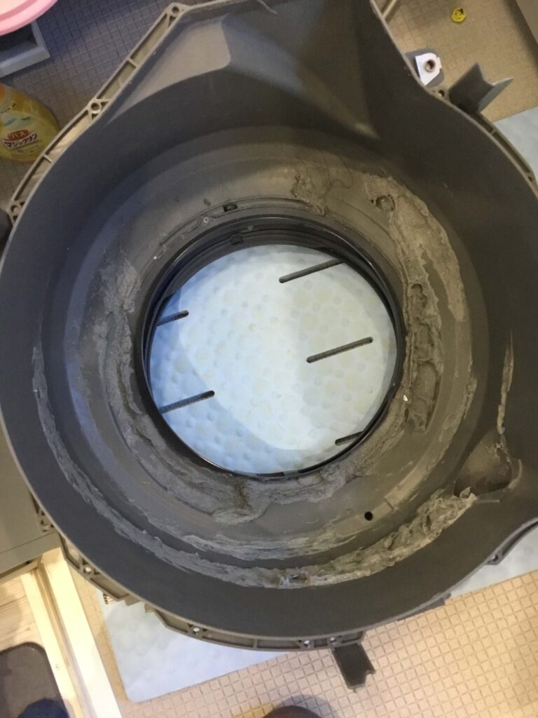 脱水受けカバーです。以前のVXシリーズはここに恐ろしいほどのホコリが詰まって、ドラムによって削られて穴が開く、というトラブルが多発していましたが、LXシリーズはそれが改善されました。とはいえやはりある程度ホコリが詰まります。