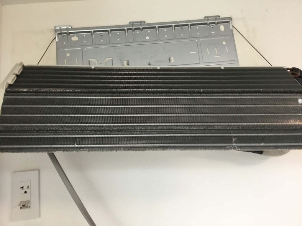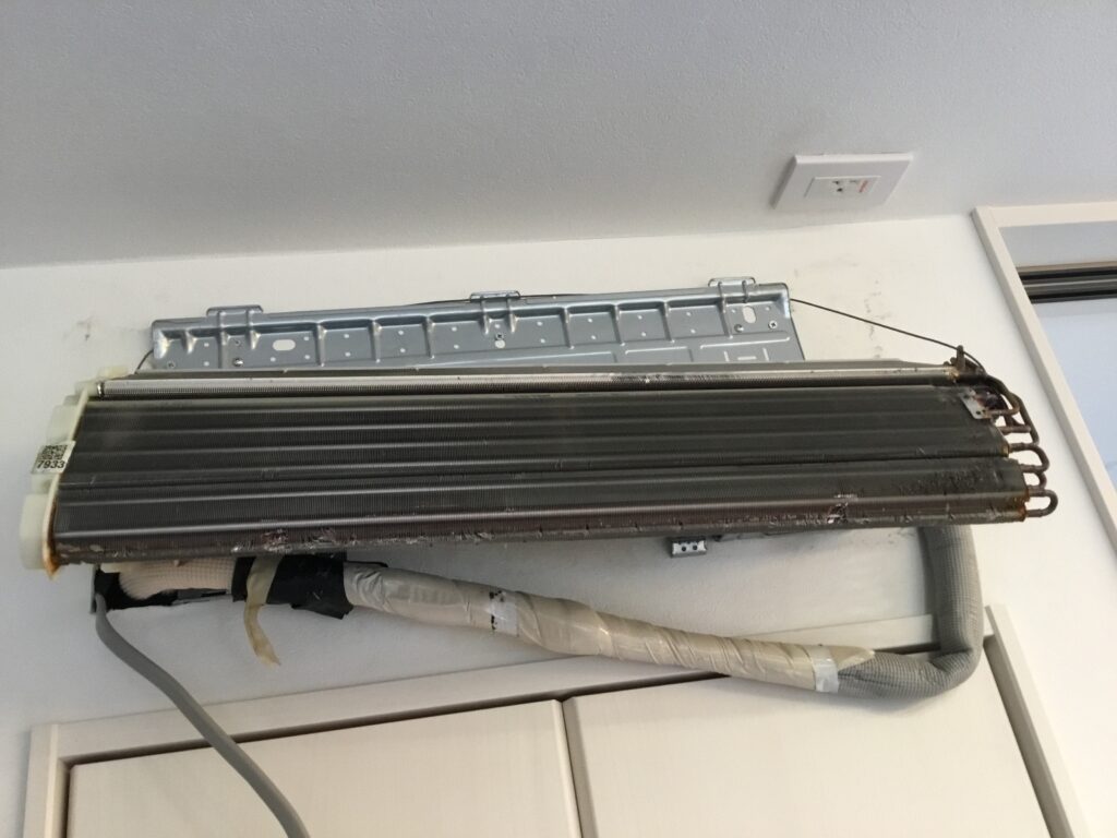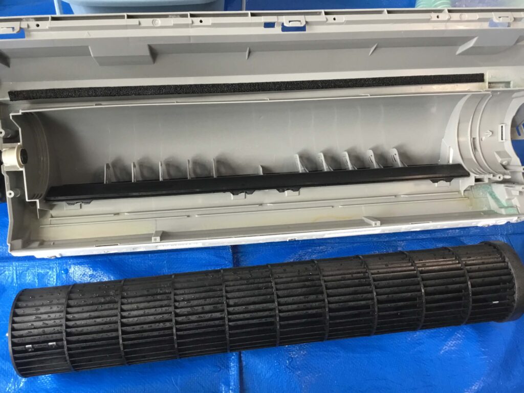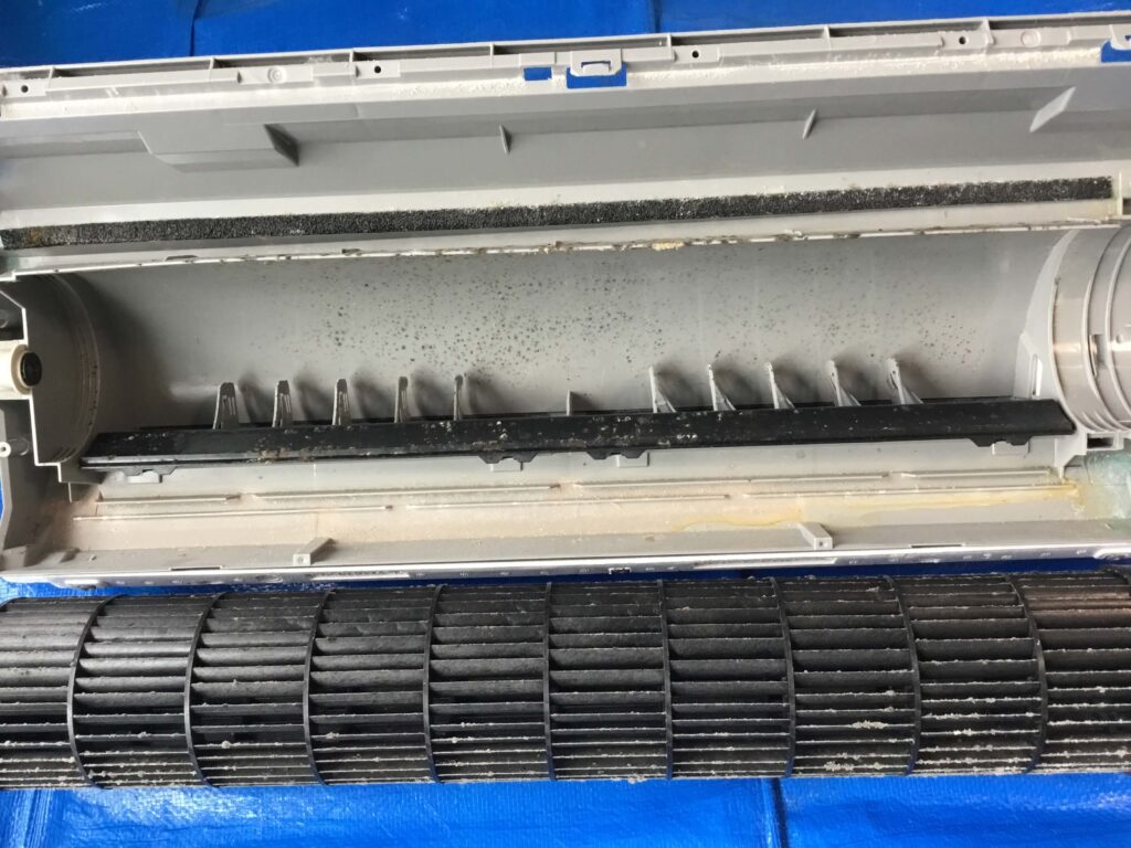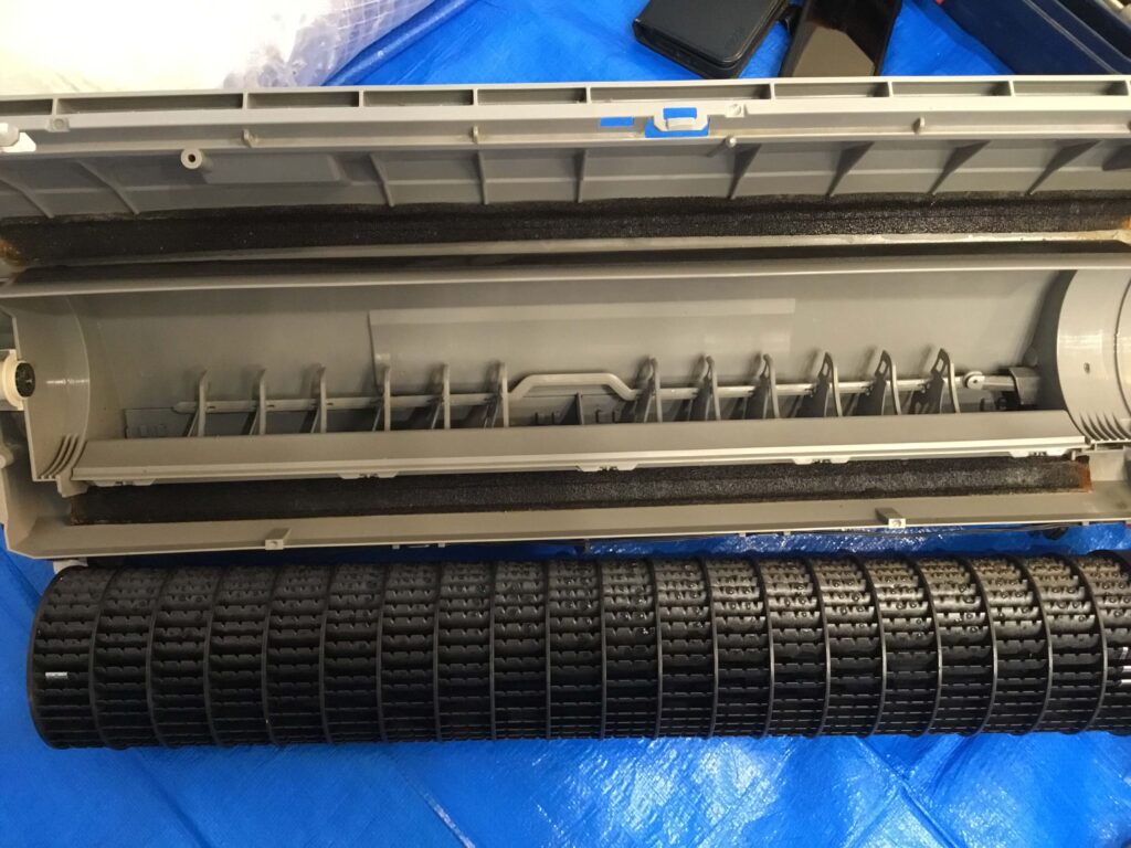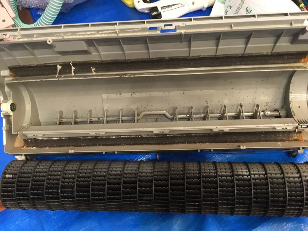 前回クリーニングしてから、恐らく冷房は3カ月ほど使用されたと思われます。しかし、昨年の夏は強烈な暑さが続いたこと、小さなお子さんがいらっしゃることや室内でペットを飼っていらっしゃることが相まって、そこそこ汚れていました。とはいえ、前回も壁掛けオーバーホールをしていますので、ホコリとカビは固着しておらず、簡単に洗い流すことができました。壁掛けオーバーホールを続けると、そういう効果もあります。